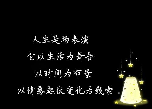 2、人生是场表演,它以生活为舞台,以时间为布景,以情感起伏变化为线索,以我们经历的人与事为情节,以精彩与成功为高潮。你哭也好,笑也罢,愿意也好,被动也罢,这是一场你无法拒绝的表演