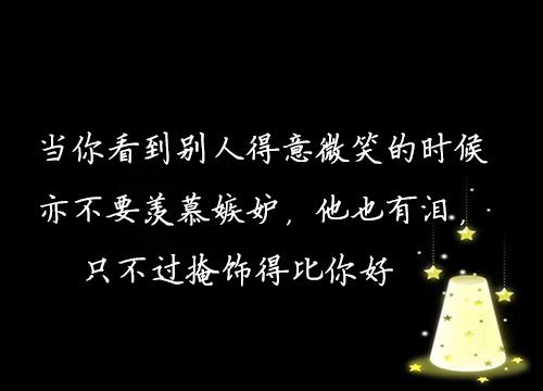3、当别人疏忽或者遗忘你的时候,无须悲观难过,大家都在一门心思往上爬,没有人可以一直陪着你;当你看到别人得意微笑的时候,亦不要羡慕嫉妒,他也有泪,只不过掩饰得比你好