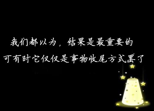 4、我们做一件事,爱一个人,总会有所期待,期待一种自己渴望的结局。可现实有时很残酷,经常偏离预想的轨道,让我们在努力中失望,在怀想中成伤。我们都以为,结果是最重要的,可有时,它仅仅是事物的收尾方式罢了