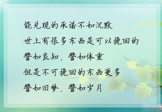 3、能兑现的承诺不如沉默;世上有很多东西是可以挽回的,譬如良知,譬如体重,但是不可挽回的东西更多,譬如旧梦,譬如岁月,譬如对一个人的感觉