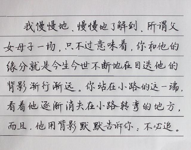 我慢慢地、慢慢地了解到,所谓父女母子一场,只不过意味着,你和他的缘分就是今生今世不断地在目送他的背影渐行渐远。你站立在小路的这一端,看着他逐渐消失在小路转弯的地方,而且,他用背影告诉你:不必追。